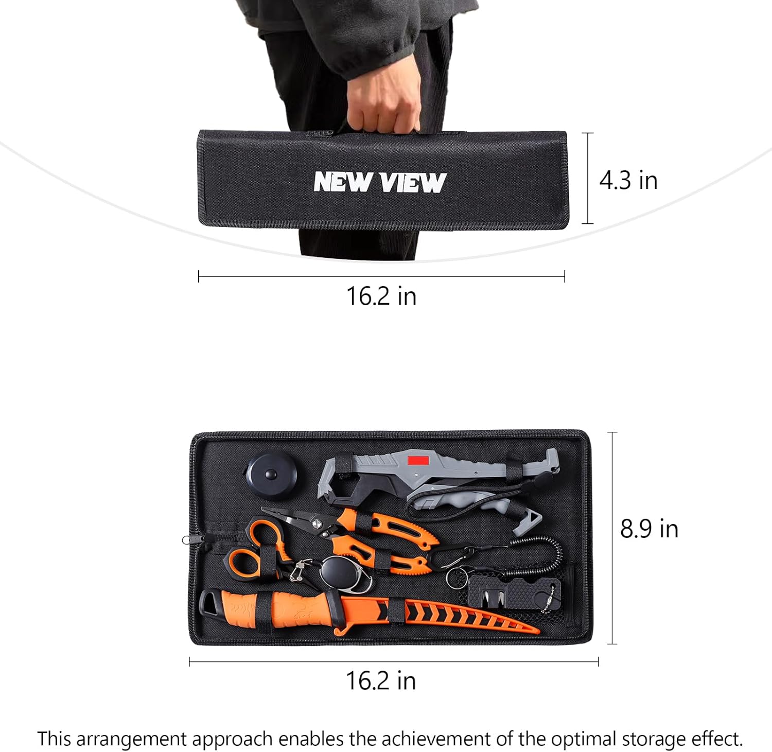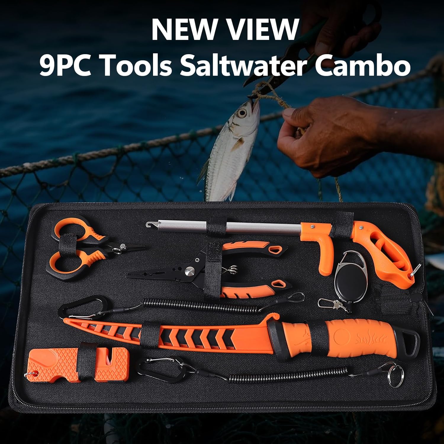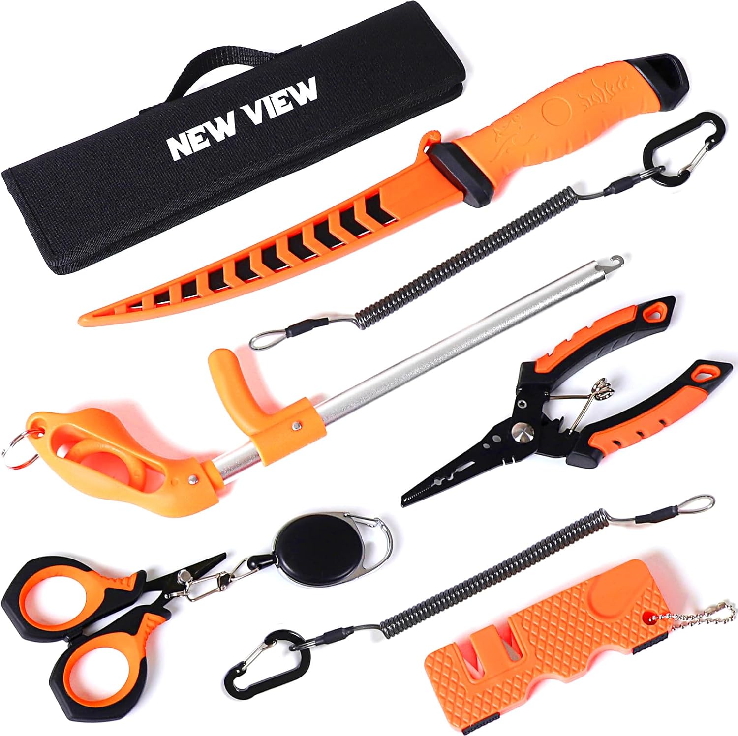 NEW VIEW 9pc & 10pc Professional Fishing Gear Tool Kit - Saltwater & Ice Fishing Tools Set - Corrosion Resistant Fishing Pliers Knife Scissors Gripper Kit with Fishing Gear Carrying Case