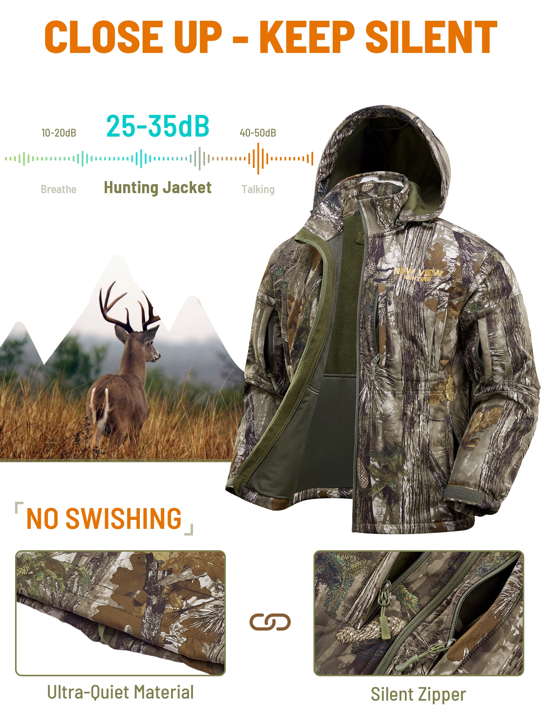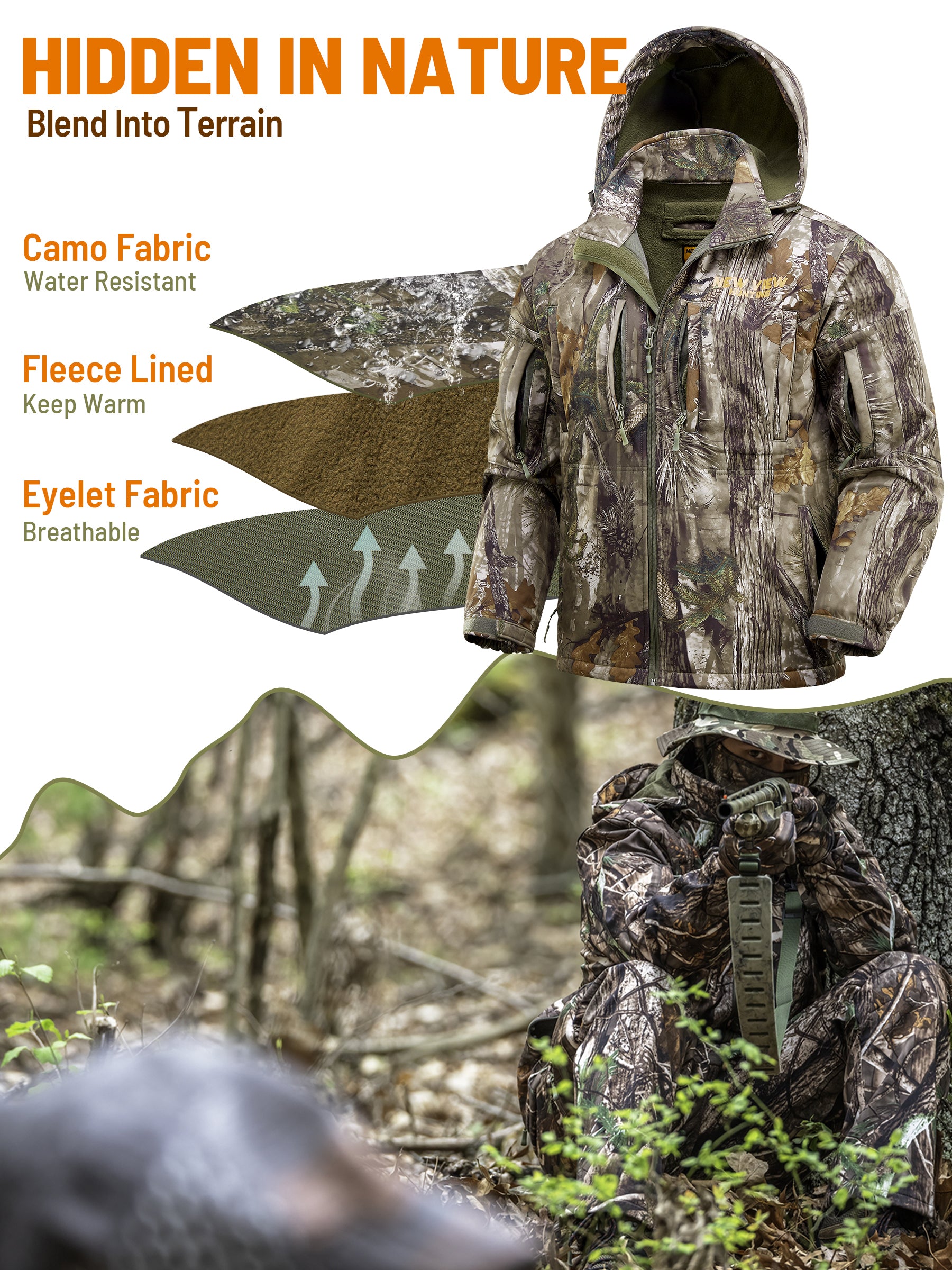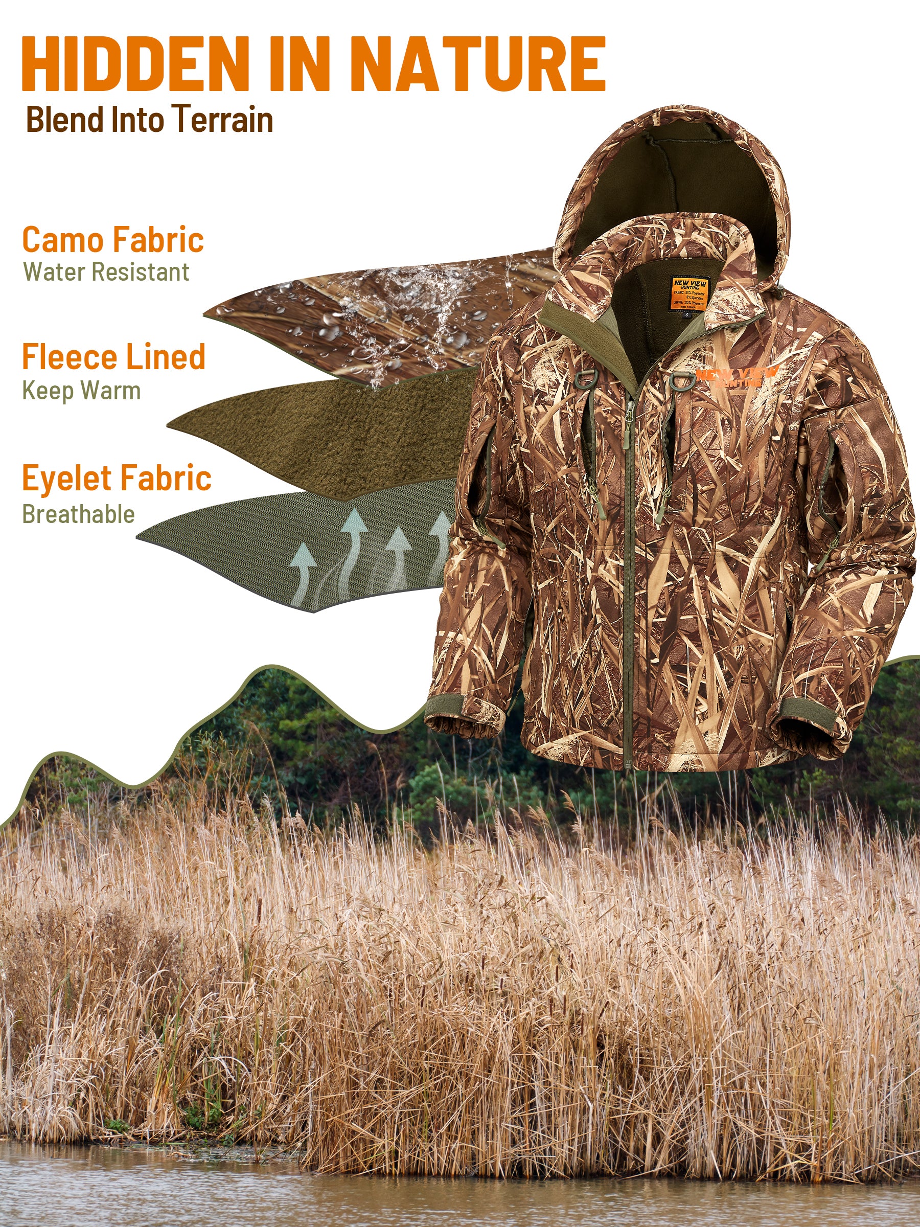 Quiet and Water-resistant Camo Hunting Jacket for Men with Fleece Lining