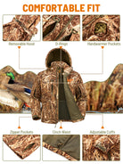 • Patented Camo Design: Unique tree, leaf, and reed camouflage patterns mimic natural terrain, helping hunters blend seamlessly into their environment.