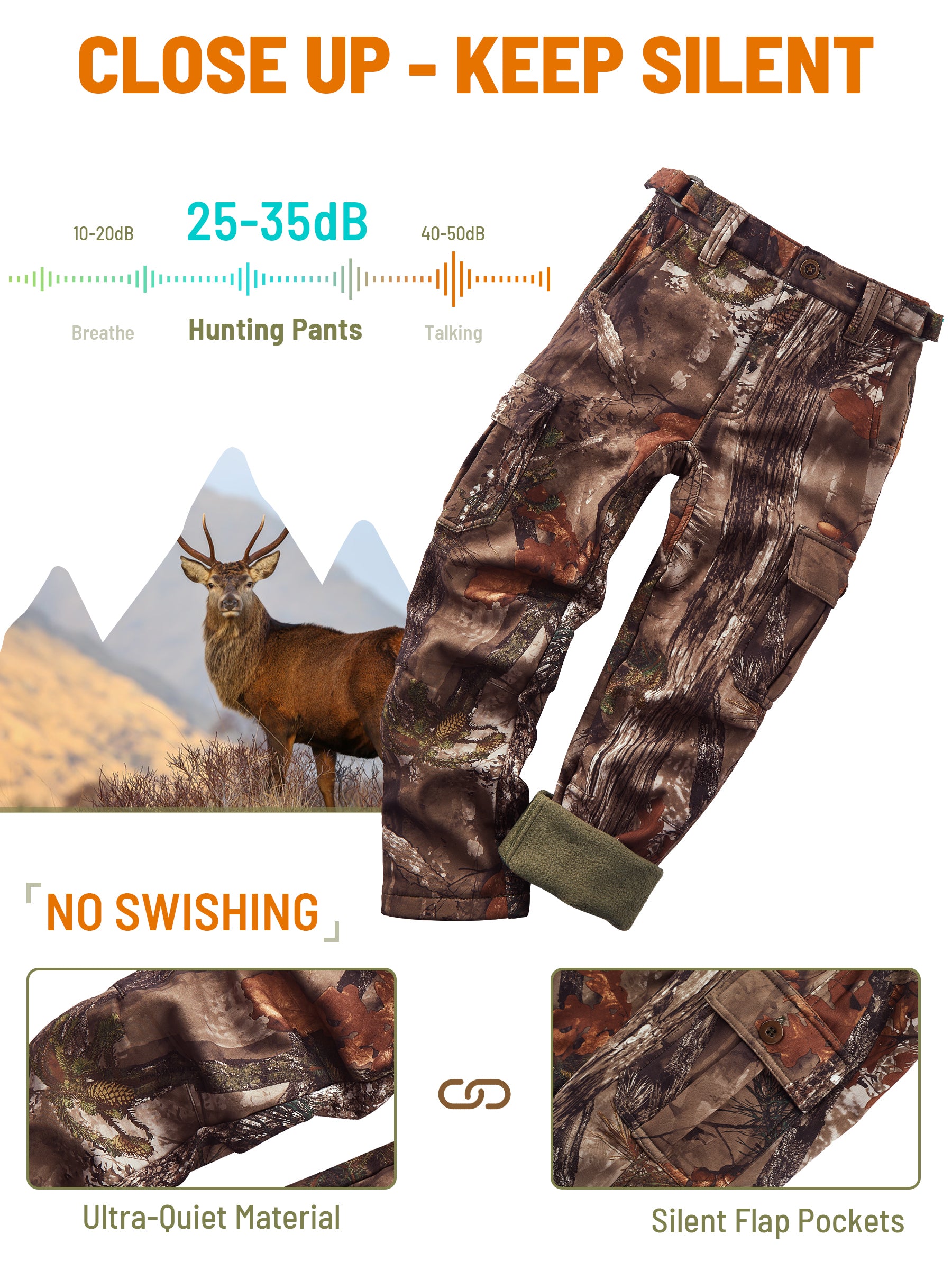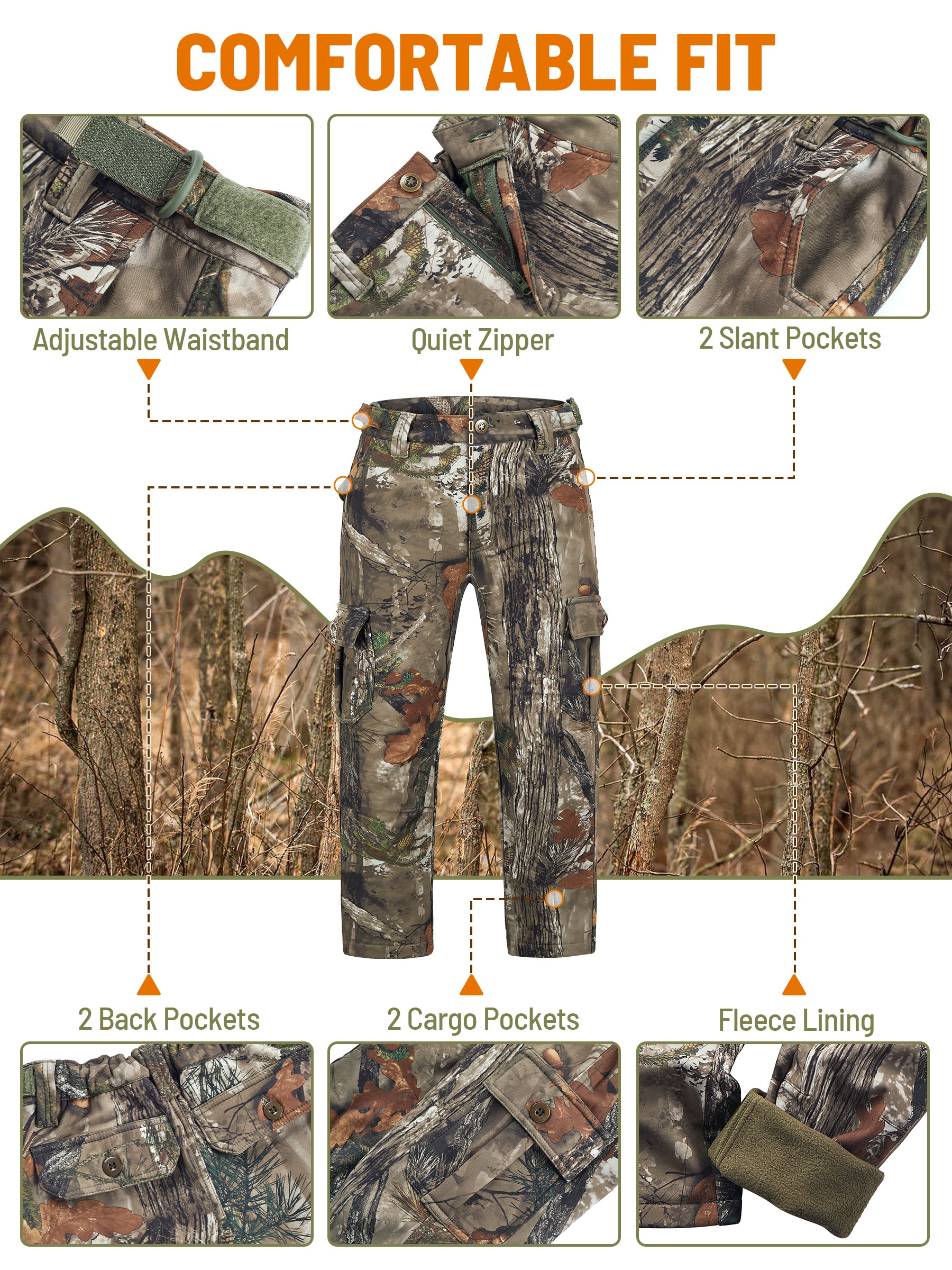 - Patented Ultra Quiet Material: Made from a new generation of silent material, these youth camo hunting pants help reduce noise, allowing for a closer approach to ducks, deer, waterfowl, turkeys, and other animals.
