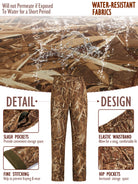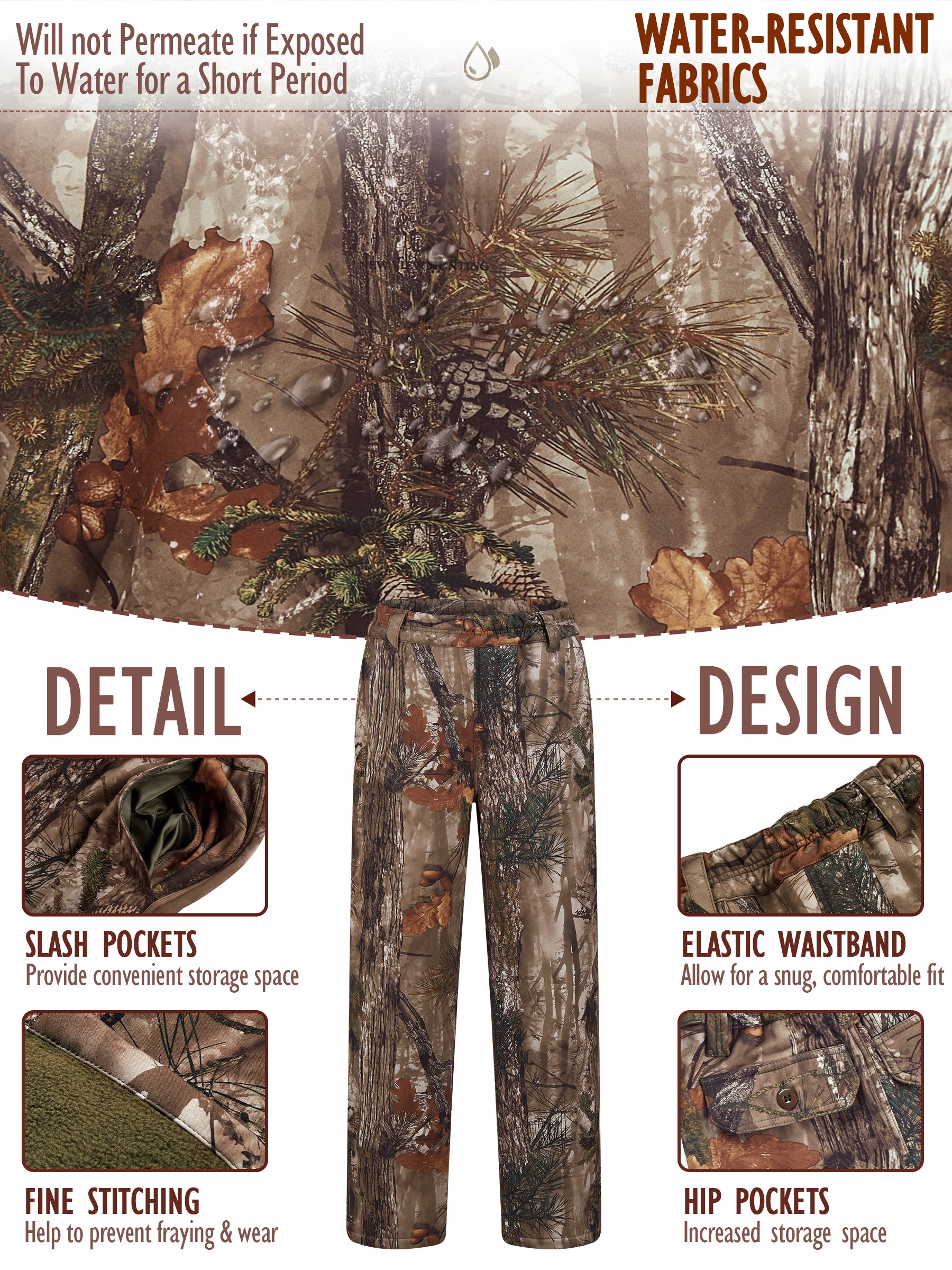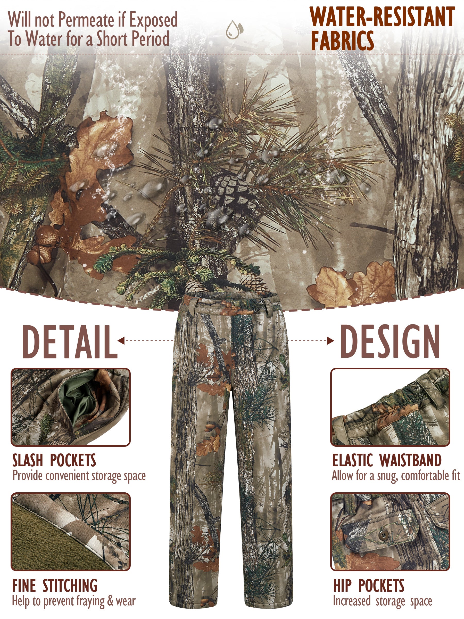 - Practical Design: Adjustable waistband, deep pockets, and water-resistant surface.
