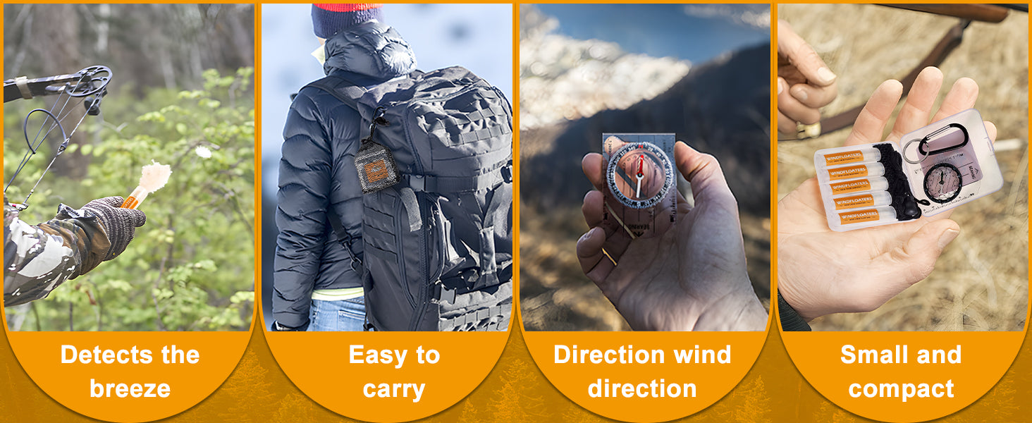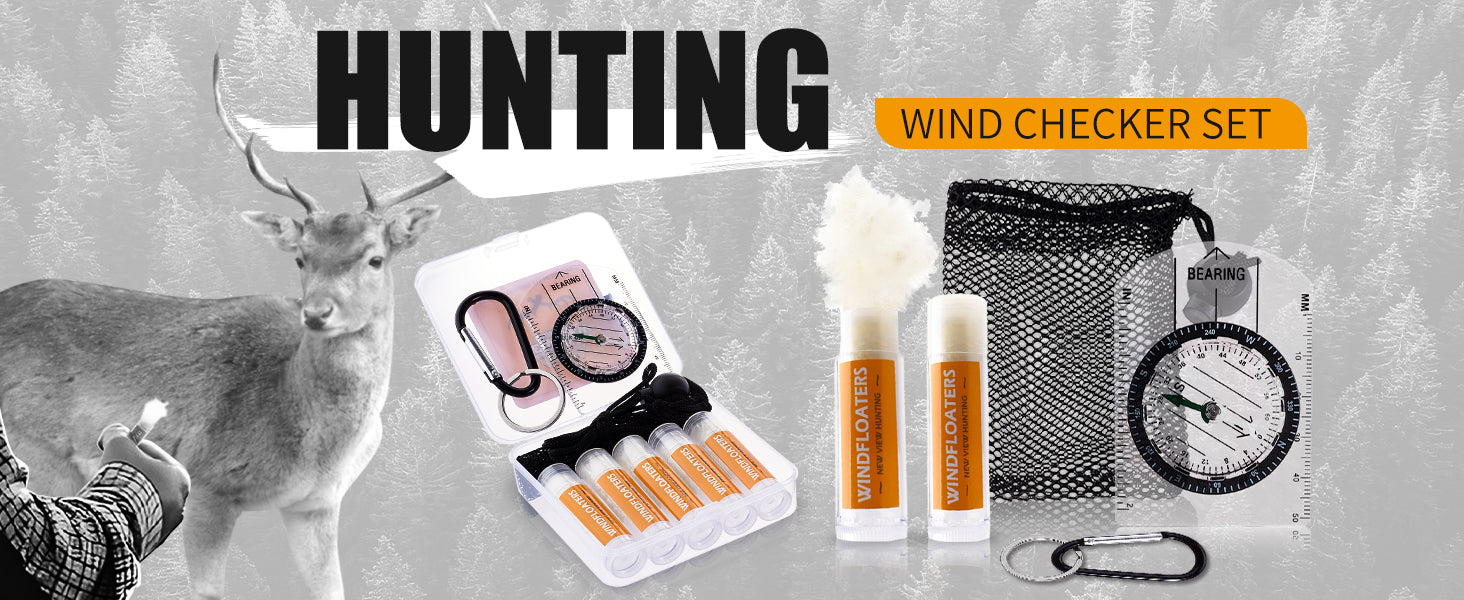 - Windfloaters for Hunters: Set includes 5 hunting wind checker bottles, a climbing D ring, a compass, mini storage containers, and a mesh drawstring bag.